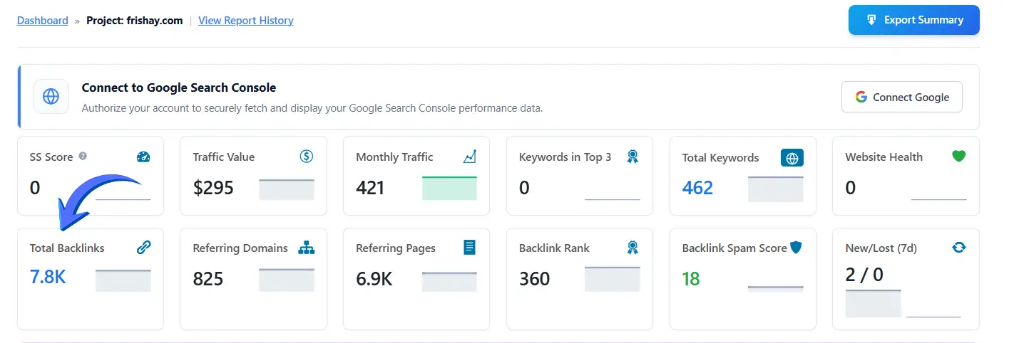Here, you can find the “Total Backlinks” section, which shows the total number of backlinks pointing to your website.